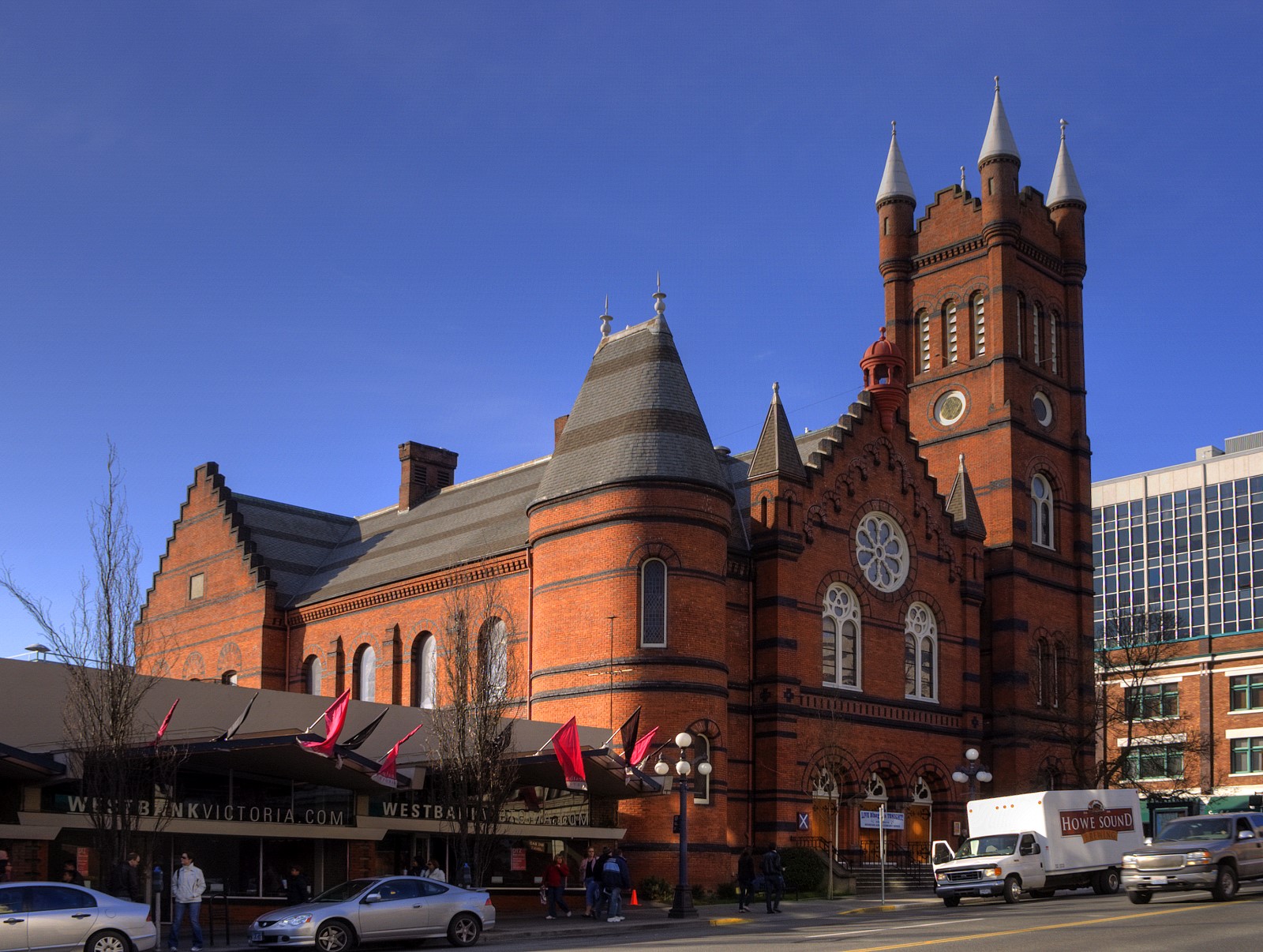 I mentioned in a recent post that in Victoria I sometimes feel I'm walking around in a large theme park. I think this comes from childhood Saturday afternoons "when you wish upon a star..." seeing Tinkerbell flying around those fabulously romantic Disney spires. A hint of all that comes back when I look at the Victoria skyline in the header photo above and see, on the right, those silvery spires against the sky. But these are not from Uncle Walt. These spires, an example of Castellated Scottish Baronial Style archtecture, are atop St. Andrew's Presbyterian Church, built in 1890 in downtown Victoria on the corner of Douglas and Courtenay Streets.