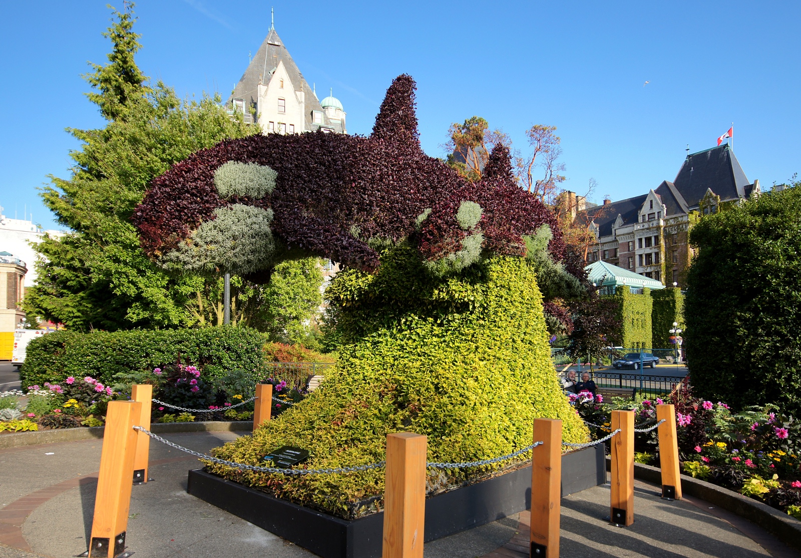 On the corner of Humboldt and Government Streets is this fanciful bit of topiary art, an Orca (Killer Whale) and her calf shaped in plants. That's the Fairmont Empress Hotel in the background.